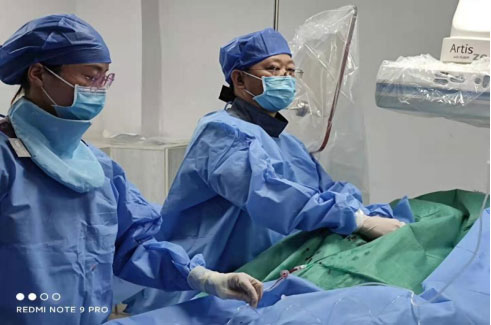 18:30分隨著一陣陣緊急的救護車警笛聲,這名患者被緊急送至導管室,郭彤主任及王桂芳主任早已守候在導管室,王桂芳主任負責跟患者家屬的術前溝通,郭彤主任負責術區(qū)消毒,準備開始手術,生命稍縱即逝,搶救分秒必爭!
