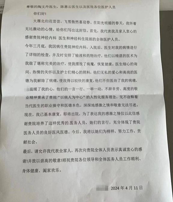 近日,我院神經(jīng)內(nèi)科一病區(qū)陳惠云副主任在四川大學(xué)華西天府醫(yī)院,神經(jīng)內(nèi)科醫(yī)療單元進(jìn)修期間收獲了一封表揚(yáng)信,信中高度贊揚(yáng)了陳惠云醫(yī)生在醫(yī)院進(jìn)修學(xué)習(xí)期間對待患者盡職盡責(zé),待患如親。