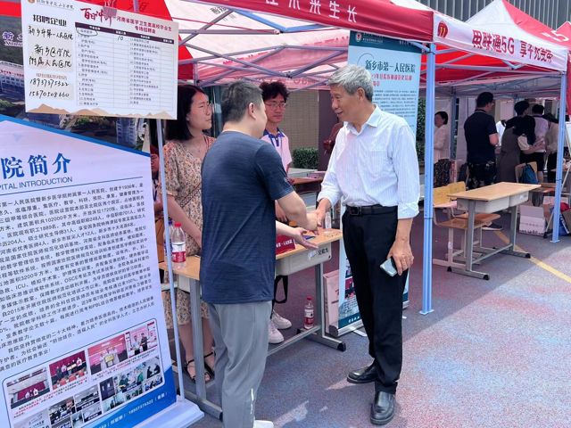 新鄉(xiāng)醫(yī)學(xué)院三全學(xué)院臨床學(xué)院院長路成吉非常重視此次招聘工作,并大力支持住院醫(yī)師規(guī)范化培訓(xùn),也親臨我院展位前,了解我院住培相關(guān)特色,鼓勵(lì)即將畢業(yè)的同學(xué)們,了解住院醫(yī)師規(guī)范化培訓(xùn)、了解全科醫(yī)學(xué),秦毅老師也對(duì)路院長對(duì)我院住培工作的認(rèn)可與支持表達(dá)深深得感謝。